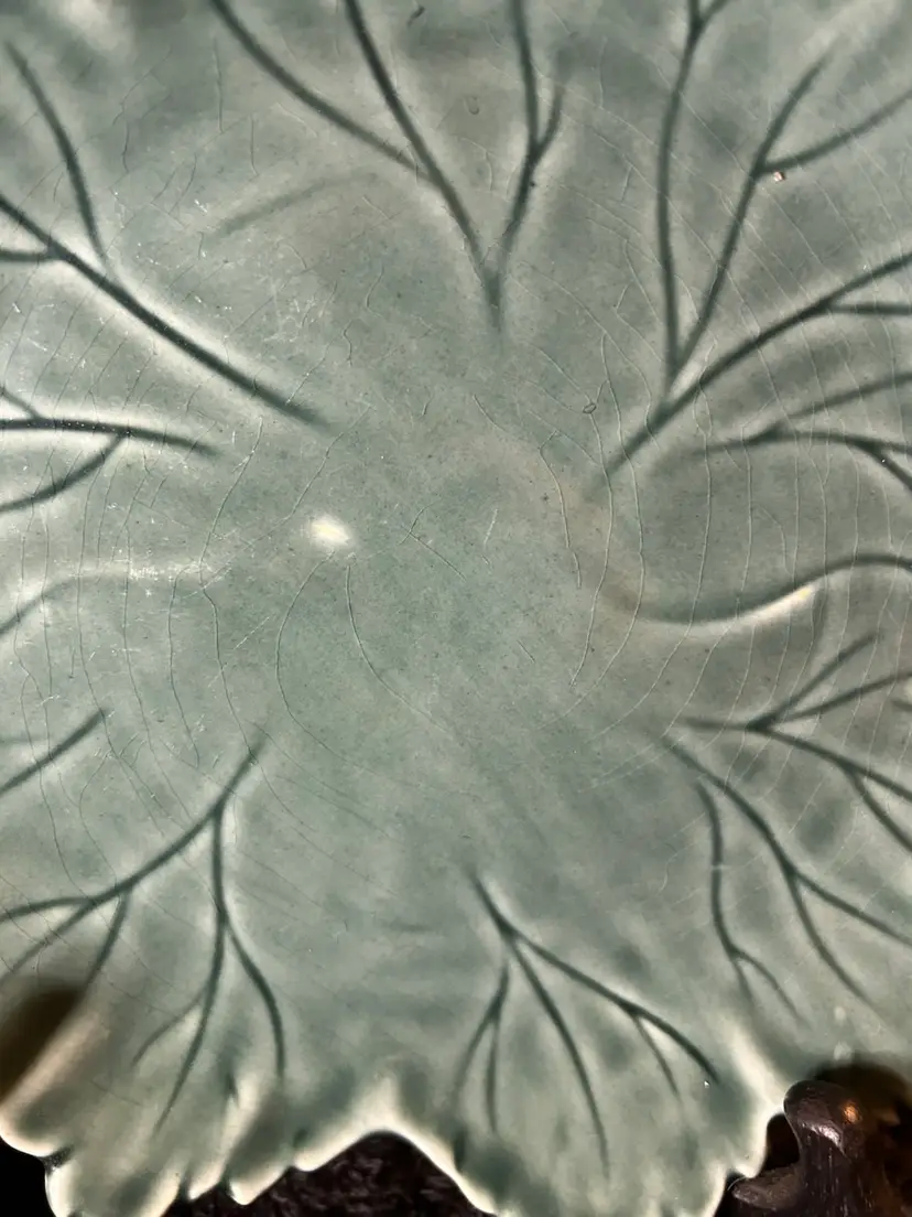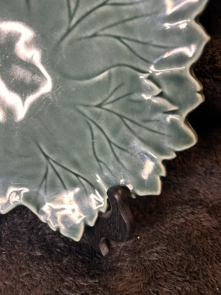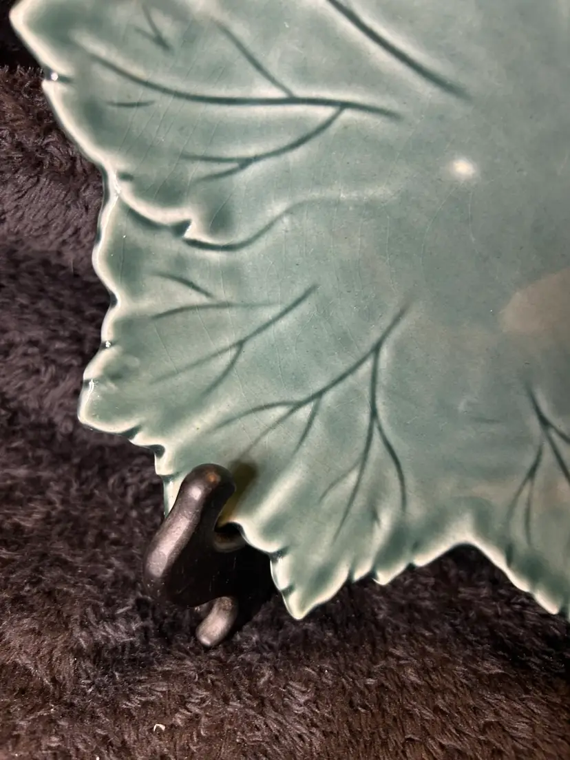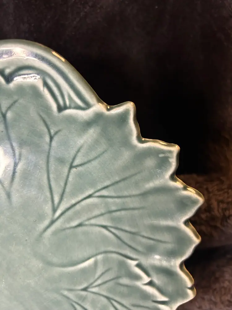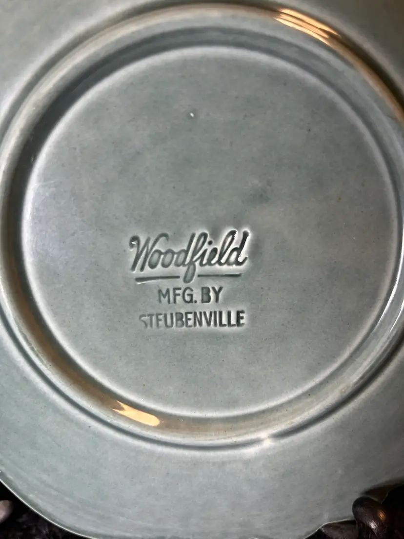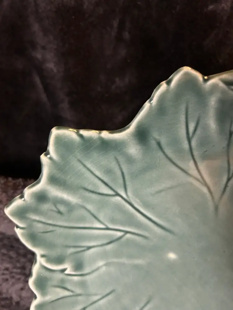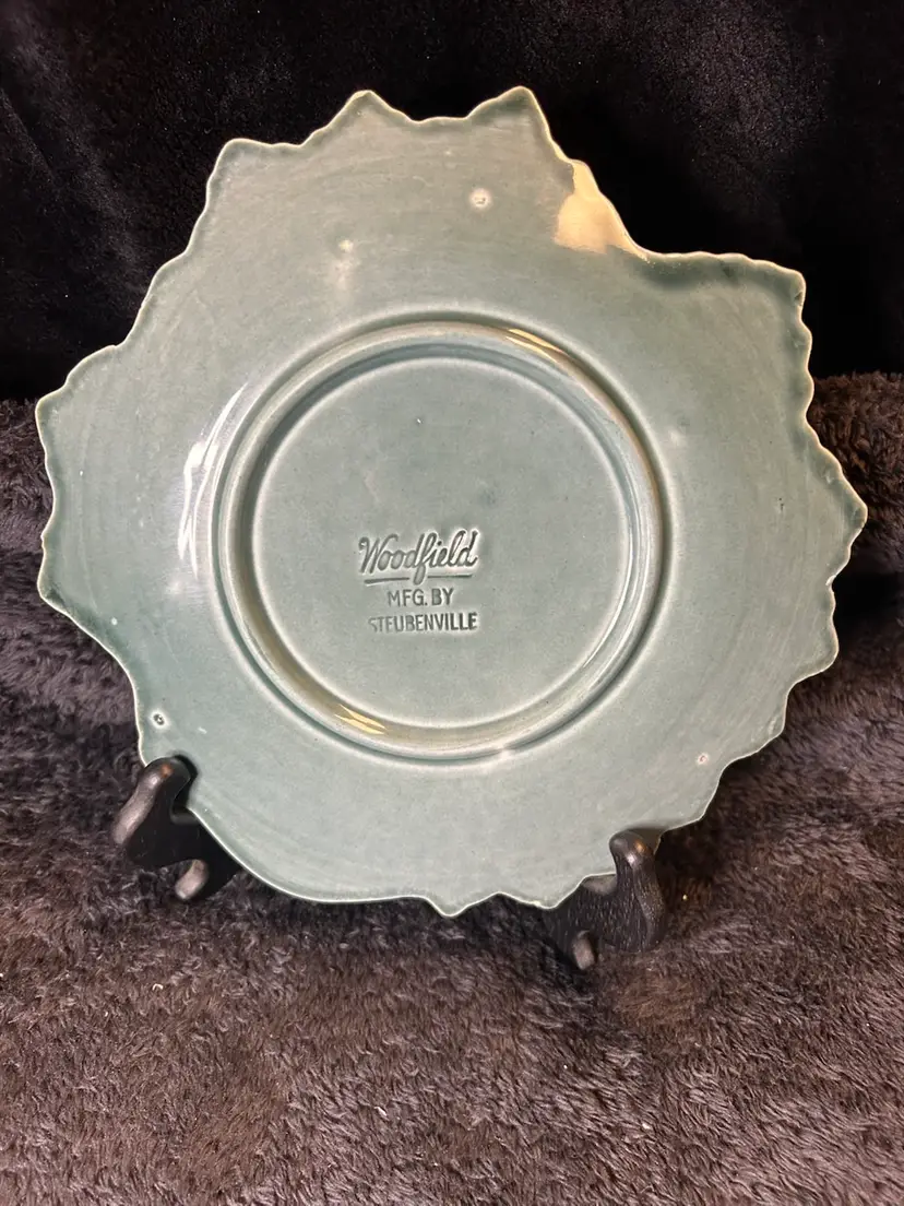 This item is a vintage Steubenville Woodfield green majolica leaf plate, manufactured around 1941 to 1951
